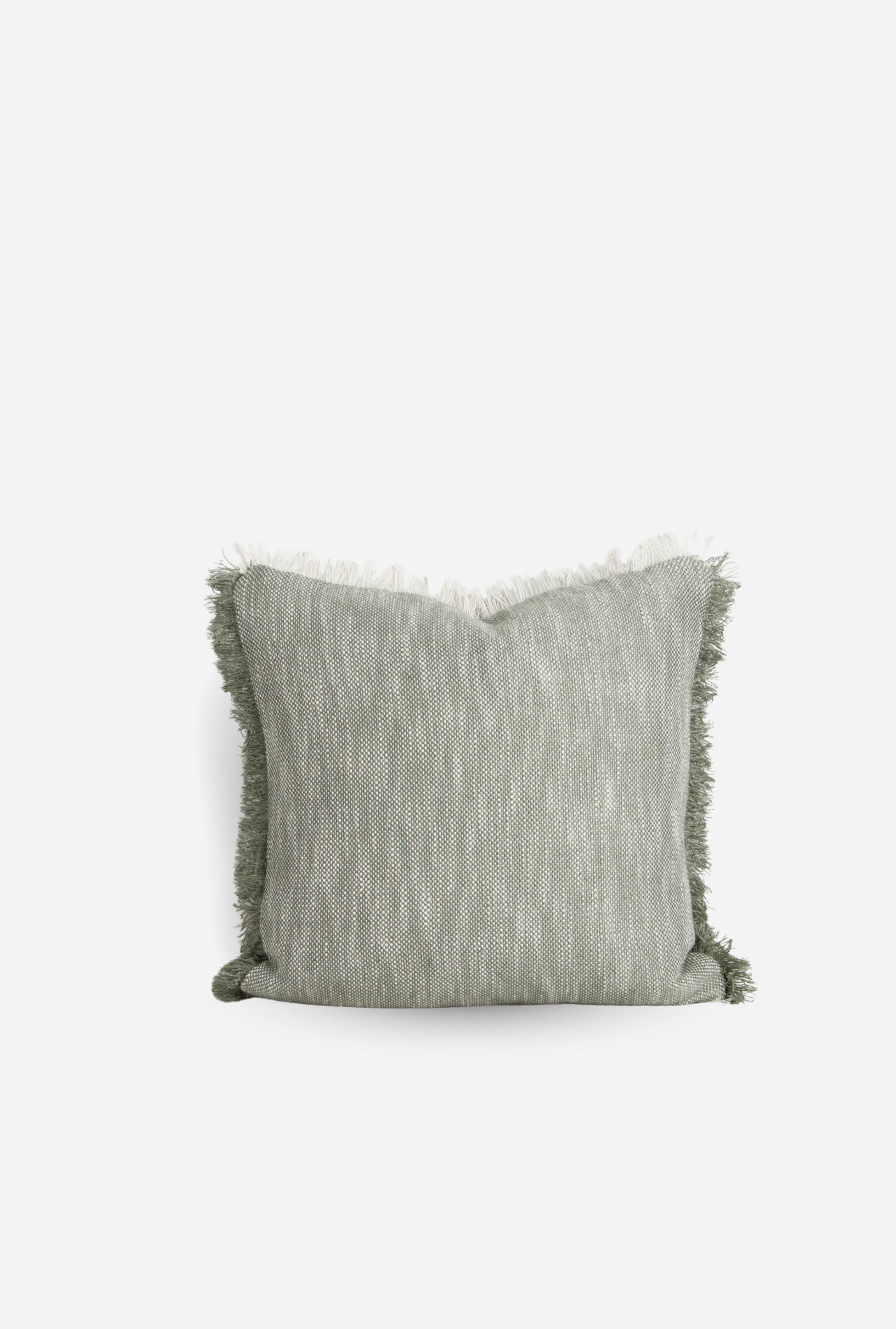 Add visual interest and dimension to outdoor settings with the relaxed design of the Caspian cushion. Featuring soft eucalyptus and ivory tones, the simple weave and two-tone fringing provides a simple, textural aesthetic for contemporary living spaces. Handwoven from soft PET yarn, this versatile piece works just as well styled indoors, especially in areas exposed to sunlight. This cushion is crafted using soft, recycled PET yarn, a resilient fibre made from recycled plastic bottles. 17 plastic bottles were saved from landfill to create this piece.