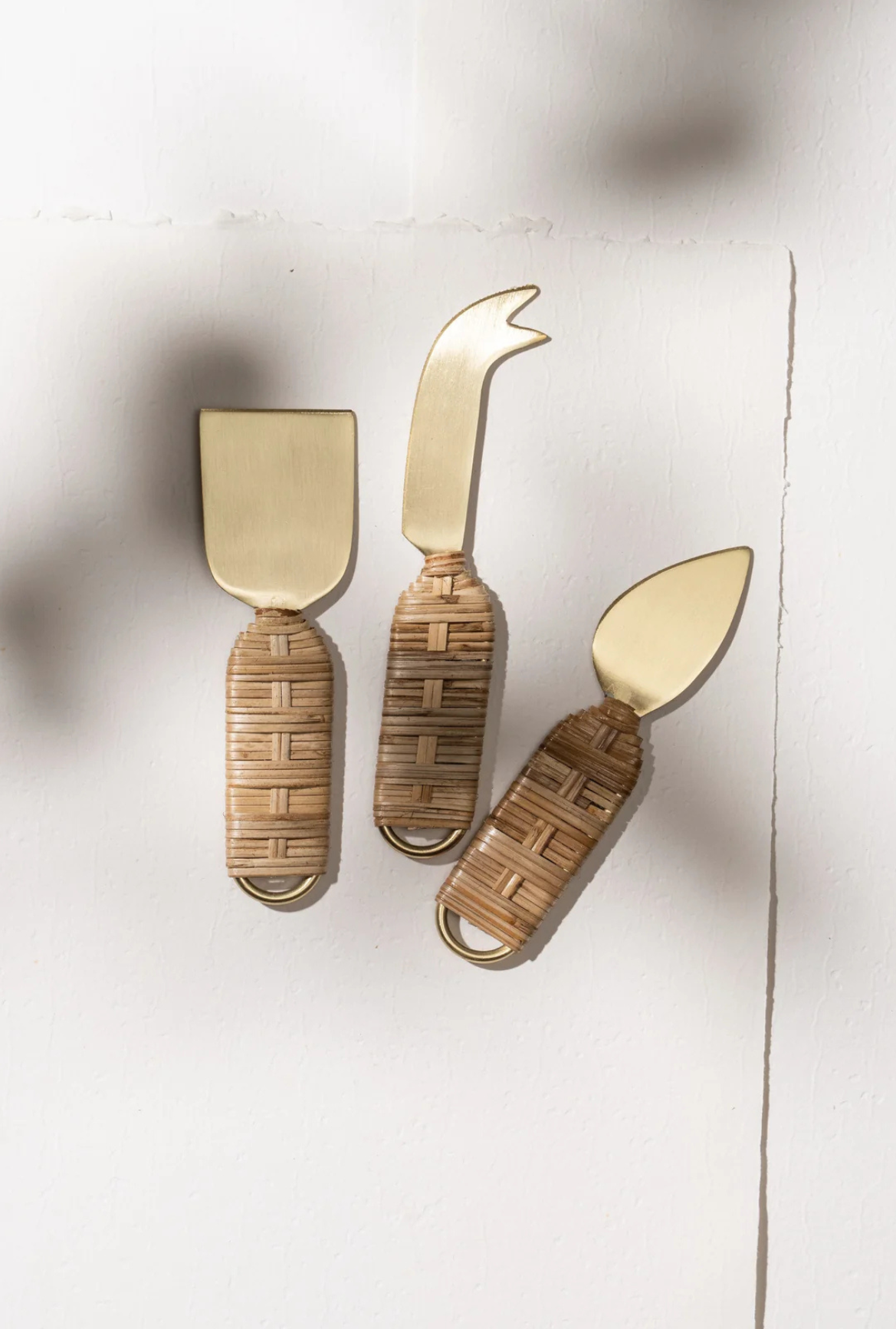 Handcrafted cheese knives made in India. These cheese knives are made from stainless steel with brass plating and woven rattan around their handles. These unique, beautiful pieces are perfect for serving with style. They are hand-wash only.