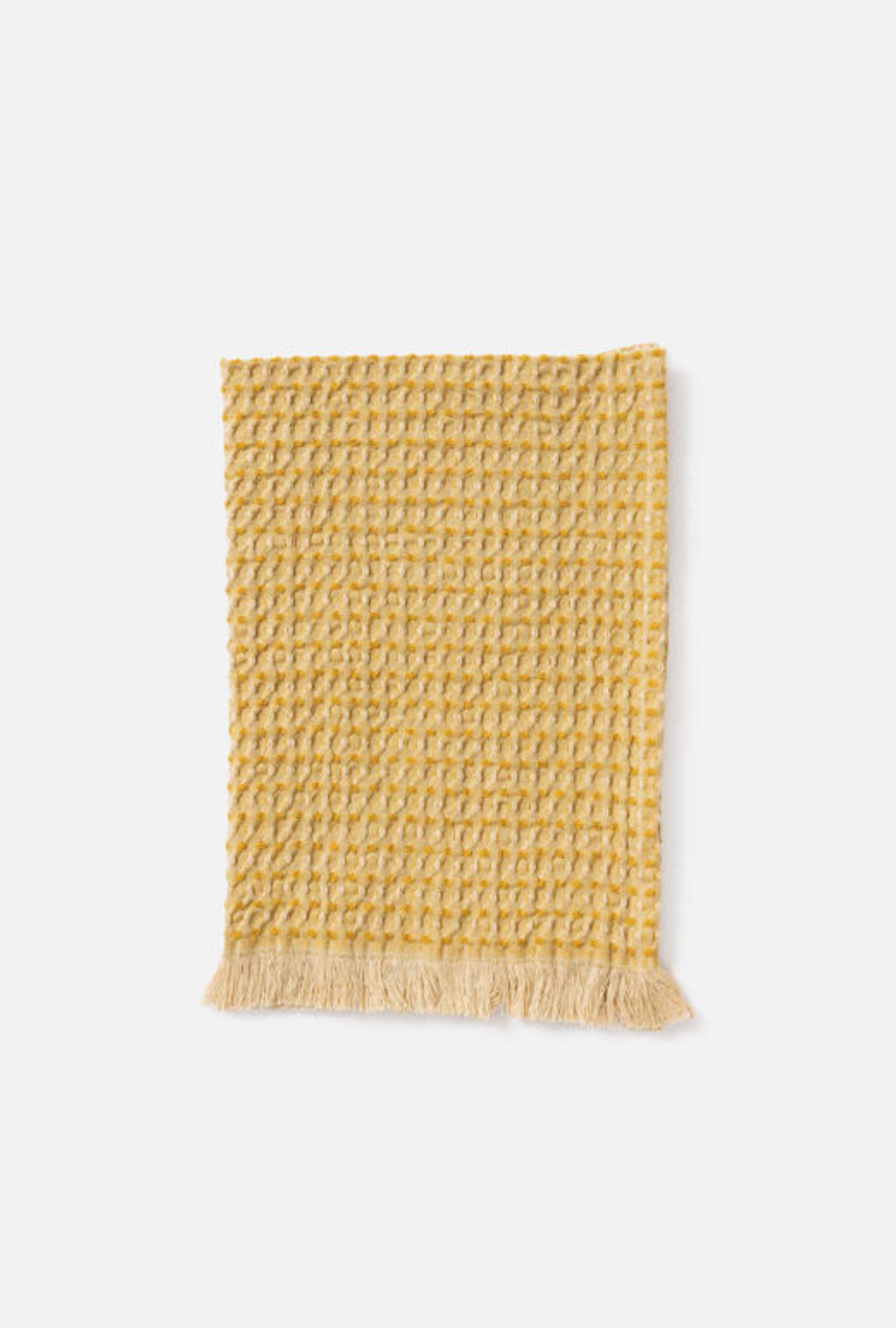 The towel combines butternut yellow with creamy butter to create a playful palette. Made with cotton in a relaxed waffle weave with a fringe detail.