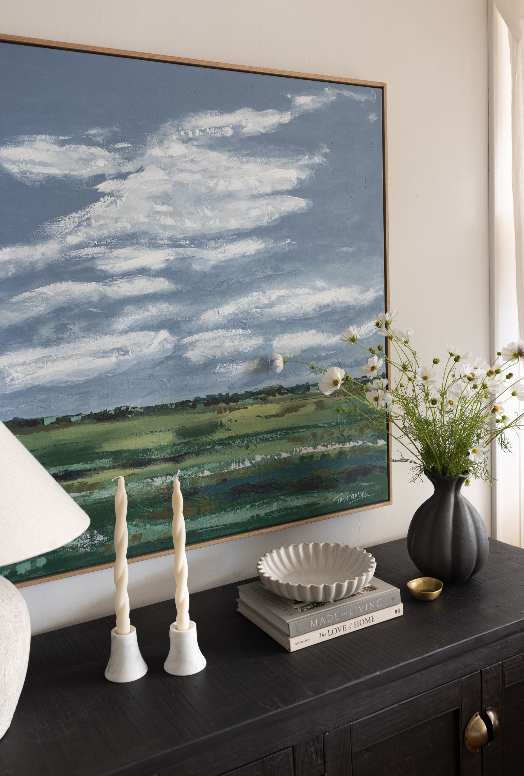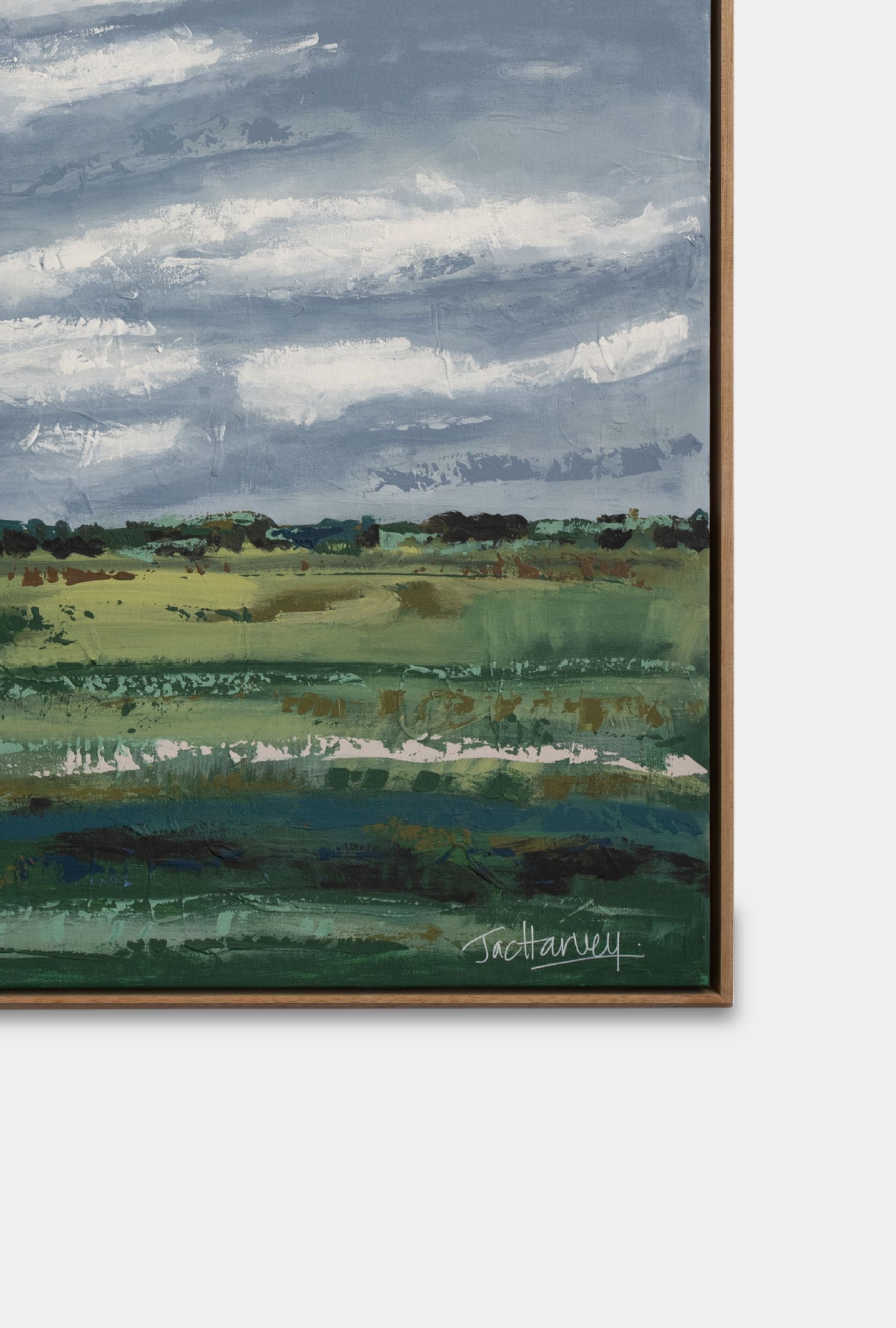 Inspired by the soft, expansive landscapes of regional New South Wales, The Quiet Horizon captures the peaceful meeting of land and sky. Through expressive brushwork and layered colour, Jac Harvey interprets the rural landscape evoking the calm stillness found in open country.