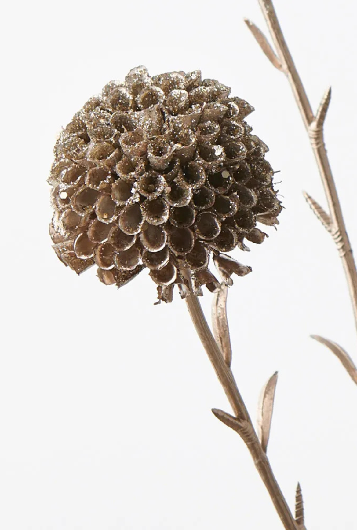 Our Champagne Marigold, a radiant bloom that embodies warmth and elegance. This three headed bloom glistens with glitter and makes for the perfect addition to your Christmas decorations.